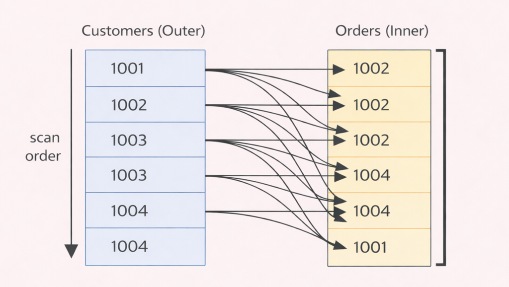 Conceptually, SQL Server reads Customers in order and uses CustomerID to look up matching rows in Orders via an index.