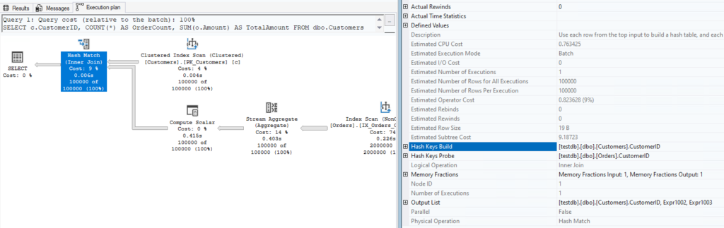 In our example, Customers has fewer rows, so the plan tends to be faster when Customers is the Outer input.