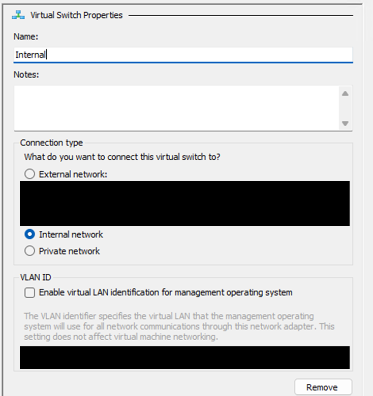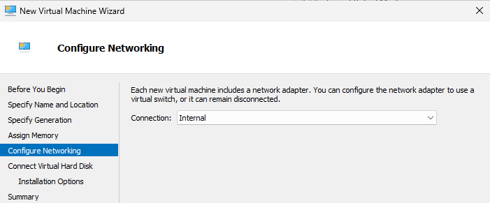 Create three VMs: AD, NODE01, and NODE02. During creation, select the internal virtual switch you created under Connection.