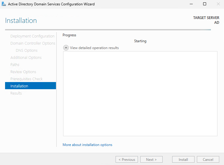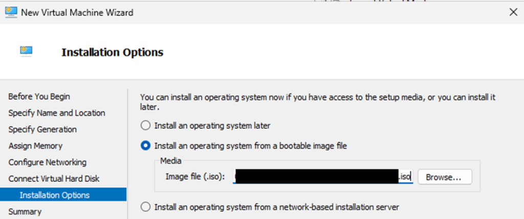 For Install Options, specify the Windows Server ISO you prepared.