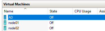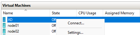 - Create VMs on Hyper-V (AD, NODE01, NODE02)