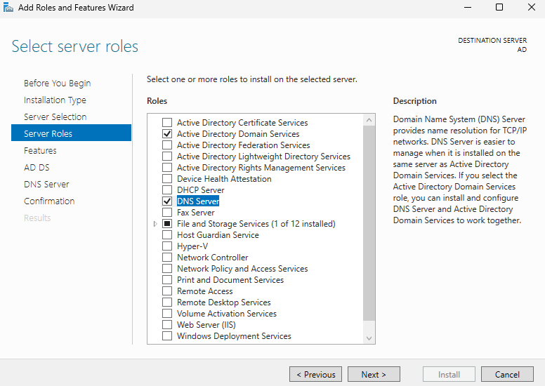 Select both Active Directory Domain Services and DNS Server, then proceed with the installation.