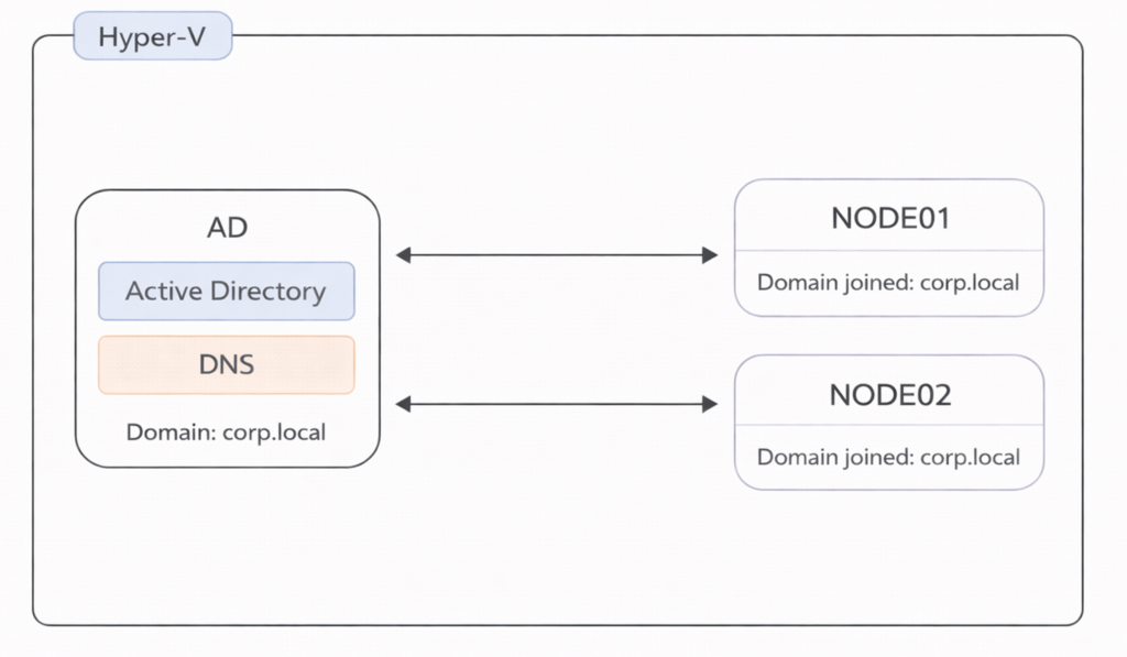 If the domain you created (corp.local) exists and AD, NODE01, and NODE02 are registered, the setup is complete.