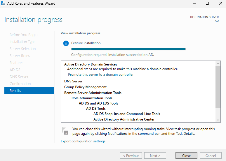 Confirm that both Active Directory Domain Services and DNS Server have been installed successfully.