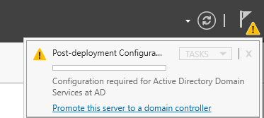 In Server Manager, check Notifications and select Promote this server to a domain controller.