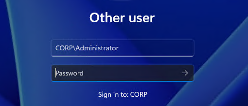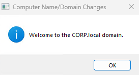 When prompted for a username and password, enter the domain administrator credentials (for example, Administrator and the password you set on the AD server). After you see the message that the computer has joined the domain, reboot the OS and confirm you can log in with a domain user (for example, CORP\Administrator).