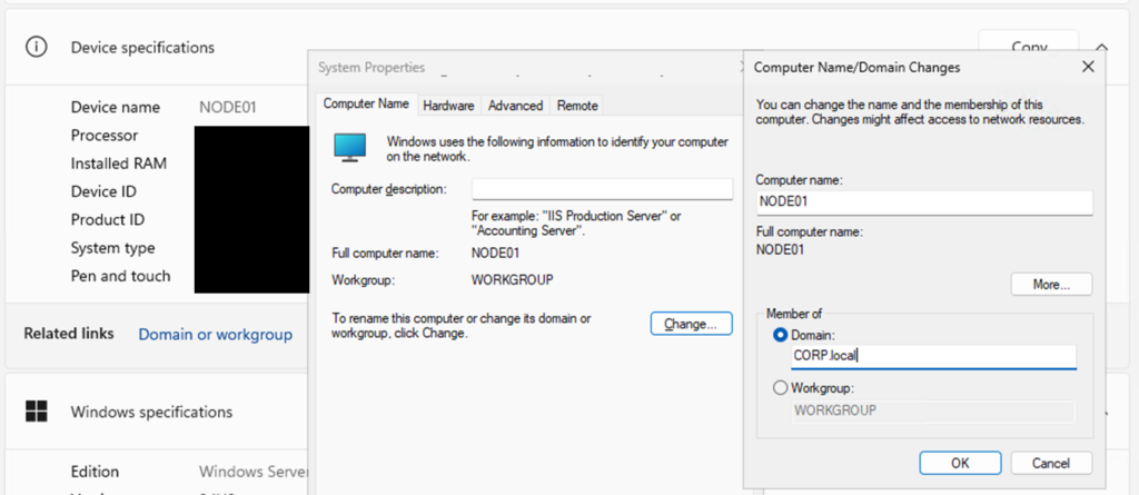 Select Domain or workgroup, then choose Change. Under Member of, enter the domain name (in this example, corp.local).