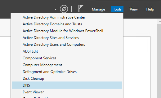 Log in to the AD server, then in Server Manager select Tools and open DNS.