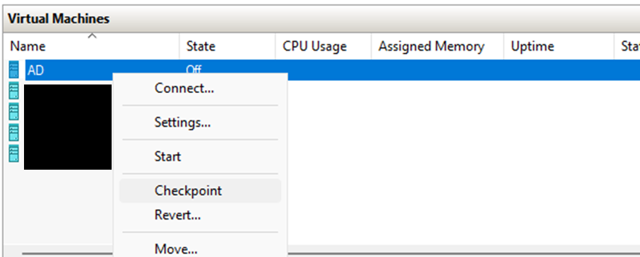 In Hyper-V Manager, create a checkpoint for each VM. By taking a checkpoint at this point, you can run experiments and later revert to the same baseline state by restoring the checkpoint.