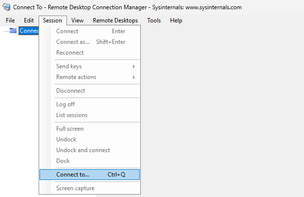 Open Remote Desktop Connection Manager and select Session > Connect To.