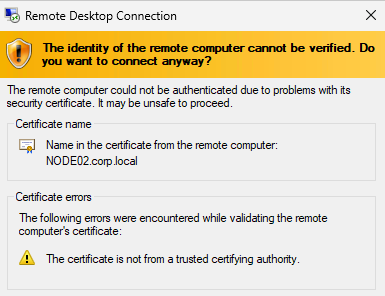 For the target server name, specify their IP addresses (for example, 192.168.1.10, 192.168.1.11, 192.168.1.12). For the username, use a domain user (for example, CORP\Administrator). If the remote desktop session opens, the connection is successful.